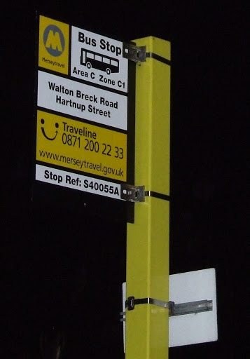 An interesting aside is that bus stops are the only place where the times that the buses should be there are actually available (subject to vandalism). The printed timetables available from Merseytravel shops and on-line only give times at four or five key points on the route, not every stop.