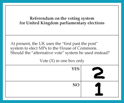 The way I understand it, under the AV system the way we vote is by putting the candidates in an order of preference. So, for example, “Do you want AV?” under AV would be answered by an enthusiast of AV as ‘First Preference Yes” and “Second Preference No”, whilst under the current first-past-the-post method “Do you want AV?” would be answered simply “Yes”.
