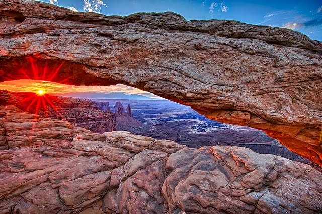 It was taken by Sharon Thomas who said of it, “Watching the sunrise at Mesa Arch in Canyonlands National Park was almost a spiritual experience….so quiet and peaceful among these giant rock formations which have existed for so many years.”