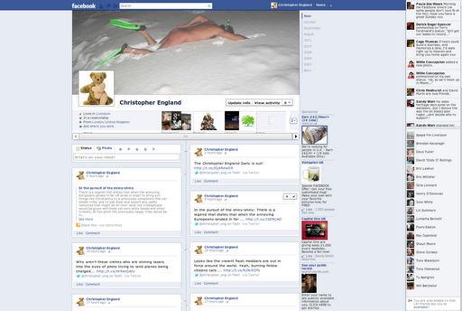 Basically, a ‘timeline’ exists as a continuous sliding line from your date of birth (there doesn’t seem to be provision to include your date of death, although I guess that might be something for the future), with everything you do finding its place on your ‘timeline’.  So, today you might put “I’m eating my breakfast” on your ‘timeline’ and it’ll stick to the precise minute that you announced to the world your mind-boggling breakfast eating news.  In ten years time you’ll be able to slide back and read that you had breakfast ‘on this day in history’.  Others can come and comment on your revelation, just as they used to be able to when you just had a ‘Wall’ on which to notify your Friends of your breakfast eating news.  Also, everything you have ever written already on Facebook is on your ‘timeline’, forever.  It never goes away!  Hey, when Facebook changes you over to ‘timeline’ mode, do make sure you take the opportunity to slide back and look at any year you like and see what a prat you were on Facebook!  I have.