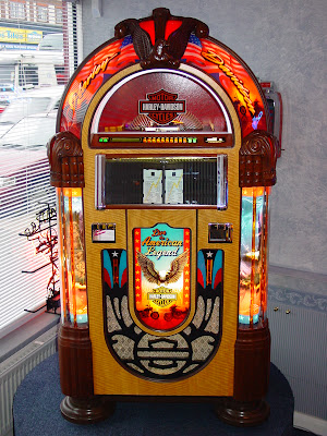 The most common device used for playing song after song was the jukebox. This mechanical device would physically load actual ‘records’ onto a turntable, drop an arm and stylus (‘needle’) onto it and then play it. When the ‘record’ came to an end, and once the jukebox had mechanically worked out that the ‘needle’ had reached the final loop track, the arm would be lifted out of the way and the ‘record’ would be grabbed and carefully taken away from the turntable and back to a dedicated rack where it would be slipped into a slot alongside all the other ‘records’. Then the mechanics would drive to the next ‘record’ that had been selected from the rack, collect it and move it to the turntable. Finally the arm with the needle would drop onto the record. After a few seconds of playing the silent run-in groove, the song would start.