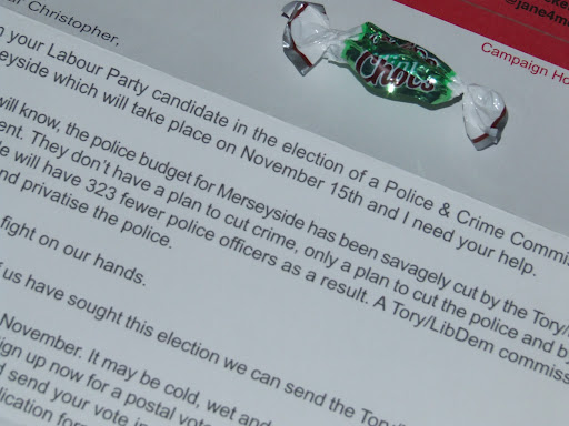 Thusly, I dismissed the bribe idea (Is it legal to buy votes with sweeties? Probably not), and have opted for the conclusion that the person delivering the Labour Party propaganda was a skanky little shit who either didn’t care and thought nothing of it, or was making some form of statement about me or my house.