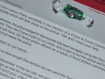 Looking at the two envelopes, one addressed to my partner, the other to me, I spied they were propaganda from the Labour Party. Some women who wants to be in charge of making it politically incorrect for the police to ever arrest anybody, was telling me how I could have a postal vote for her because it would be cold in November.