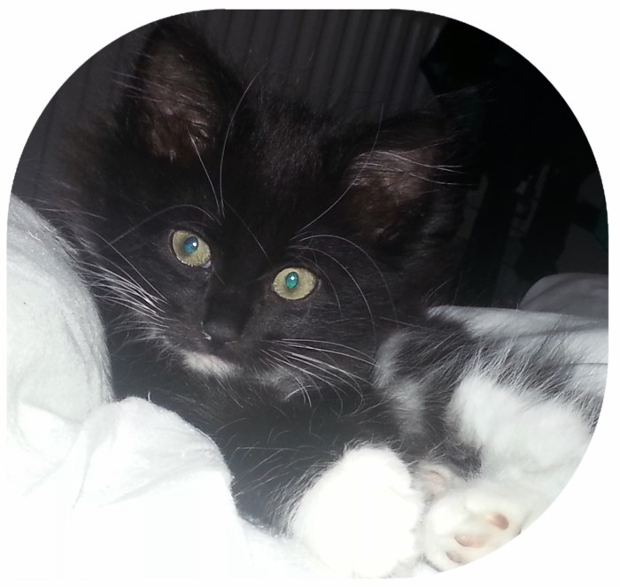 It’s mainly black, with a white belly, and white paws, and it’s a boy. We just cannot arrive at a good, yet original name.