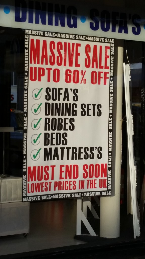 This awful printed and displayed (in multiple places) example of complete ignorance when it comes to the English language, was all over a very large department store sized shop just up a bit from Liverpool’s recently £55Million refurbished central library.  Why did they bother to spend all that money on a place holding books when Scousers are so illiterate?