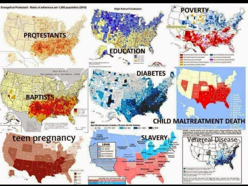 An interesting examination of a range of different but not so different ways of cataloguing the United State of America shows an interesting correlation. It’s not looking too favourable for the ‘deep south’ is it?
