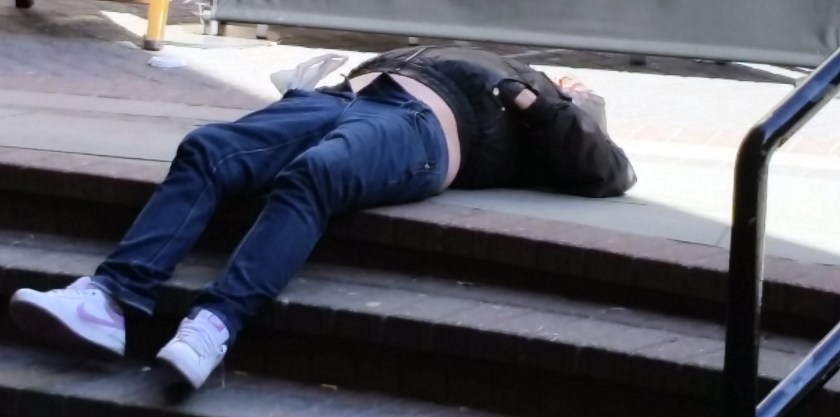 As we talked I noticed she was urinating herself through her jeans, the fly of which was also open. The urine ran down the steps she was collapsed on. Lovely.