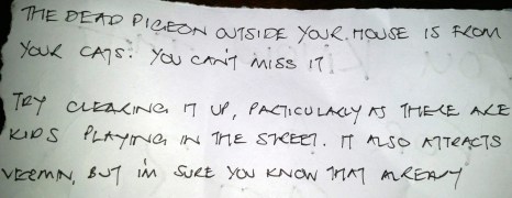 “The dead pigeon outside your house is from your cats. You can’t miss it. Try clearing it up, particularly as there are kids playing in the street. It also attracts vermin, but I’m sure you know that already” Unsigned.